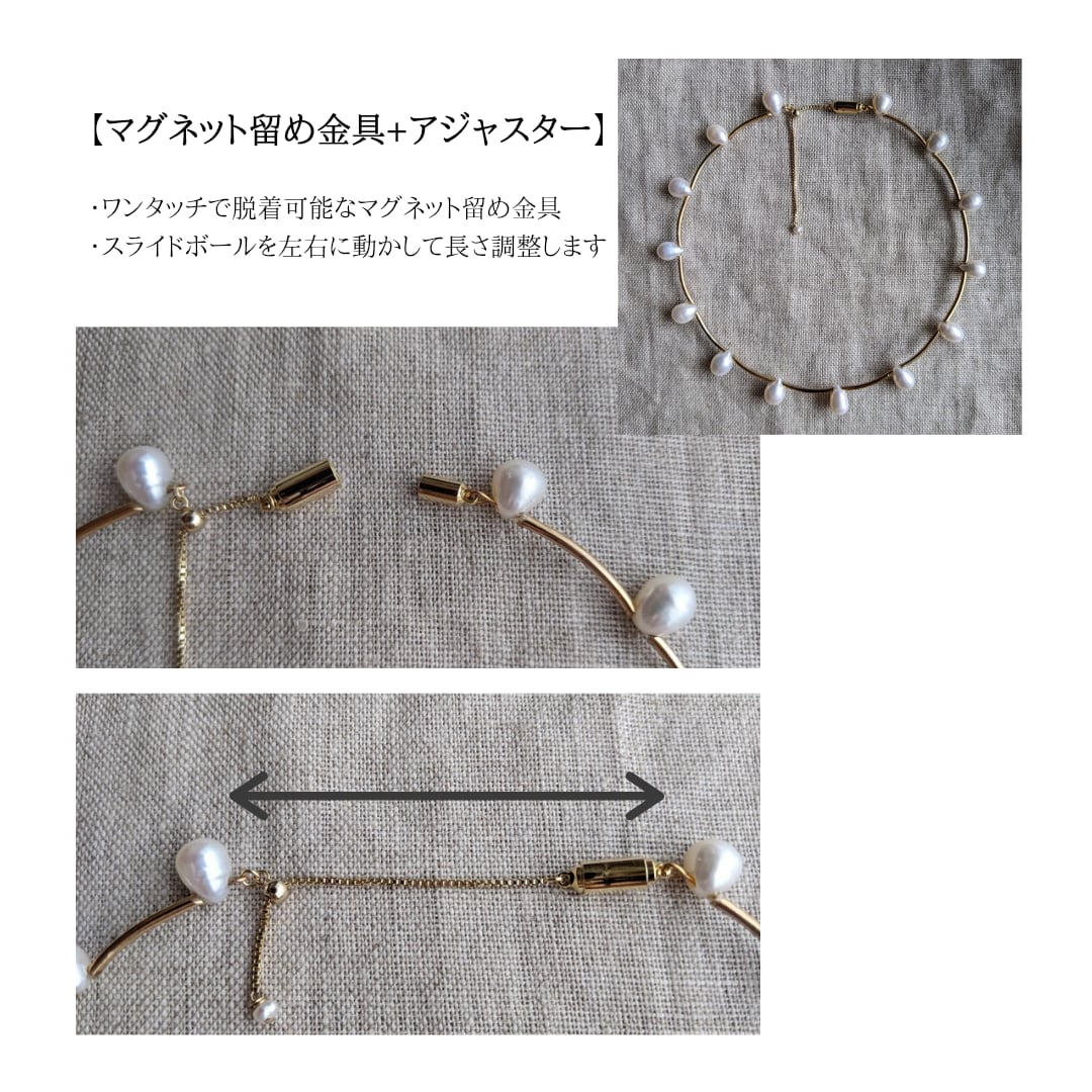 ・マグネット・・・脱着が楽なマグネット留め具。スライドボールをスライドさせることで長さが調節できます。