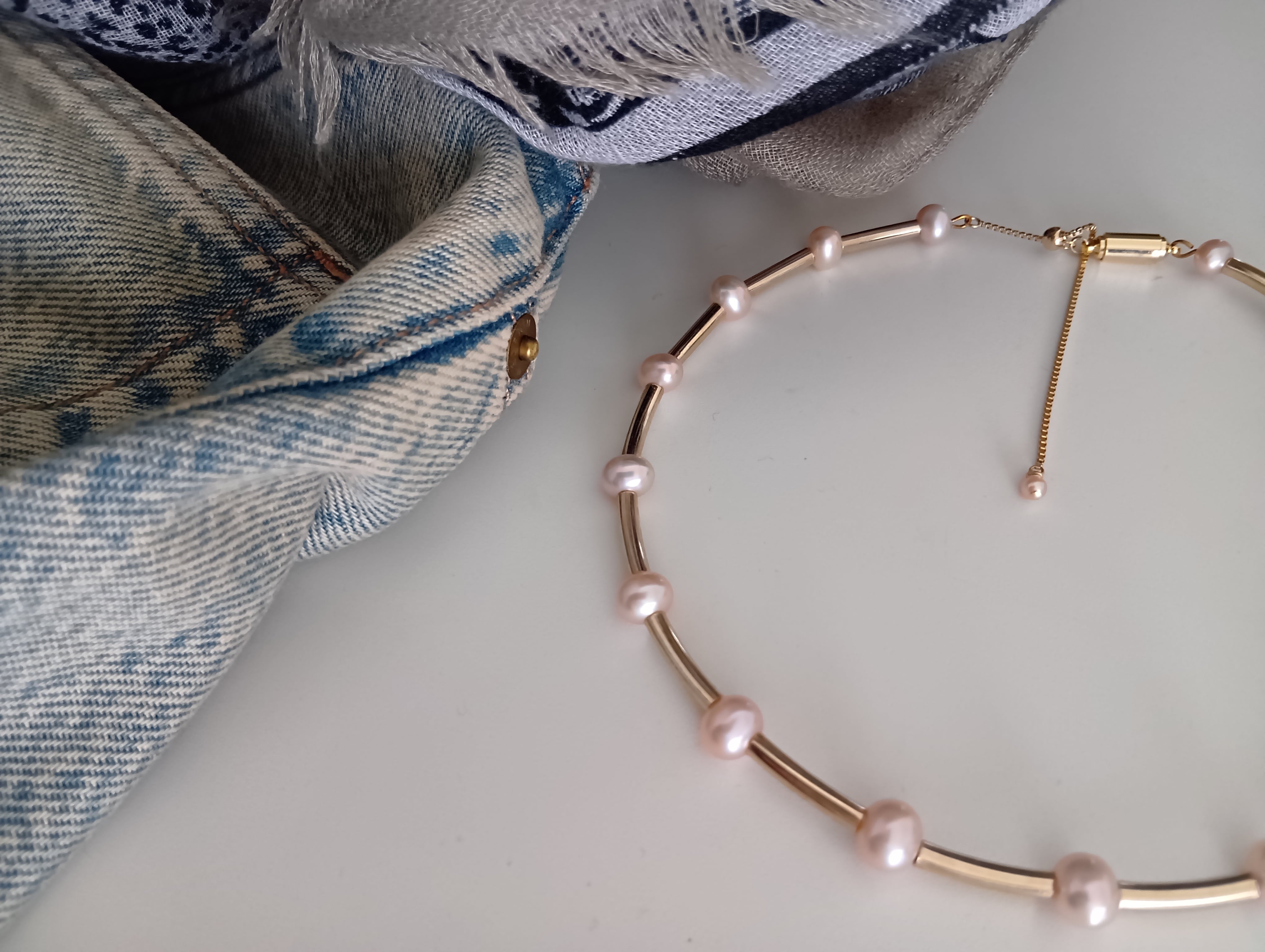 約5×7㍉の楕円形淡水パールを使用したチョーカーネックレスです。
